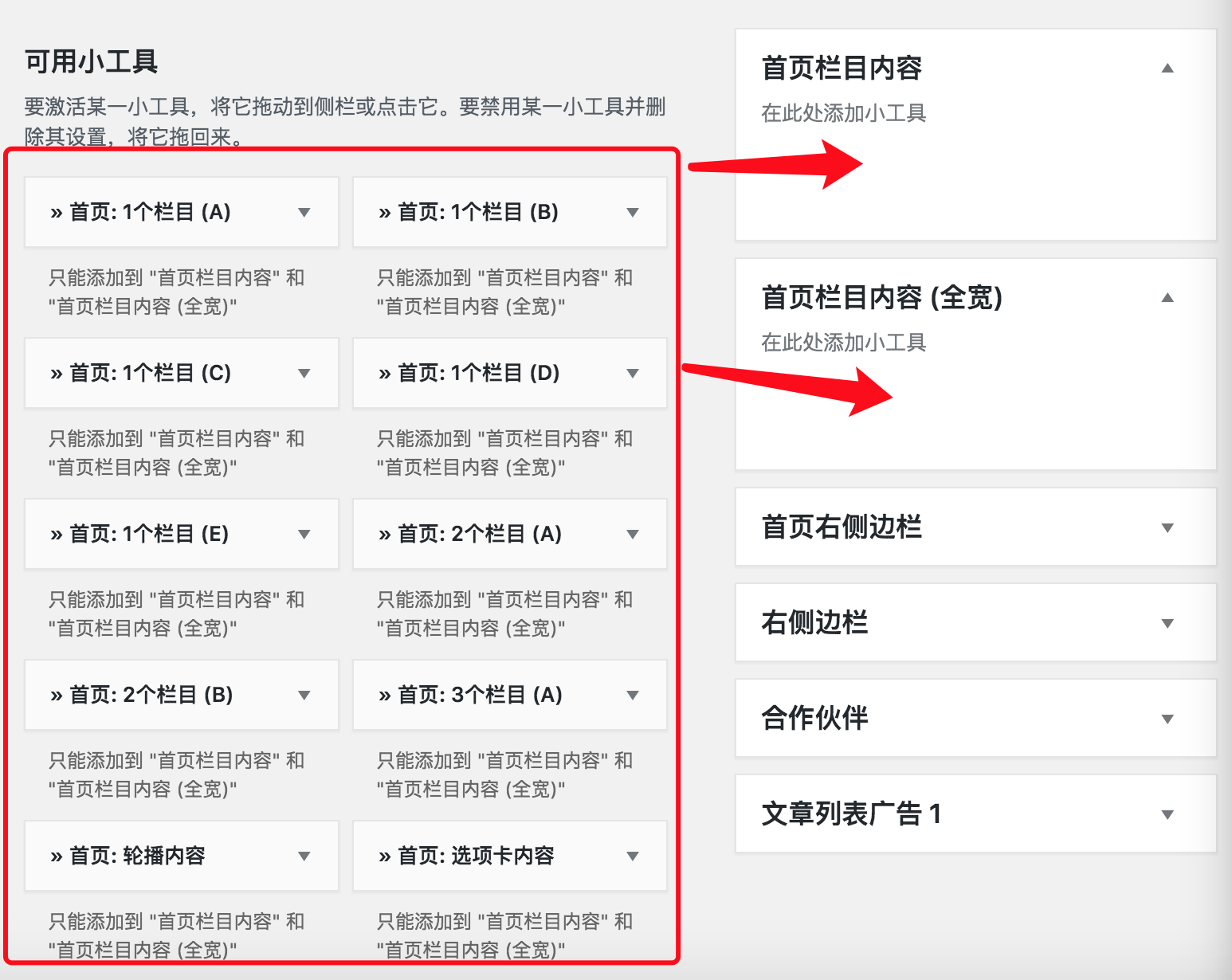 请将 "首页: xx内容" 和 "广告" 小工具添加到 首页栏目内容 和 首页栏目内容 (全宽) 区域。